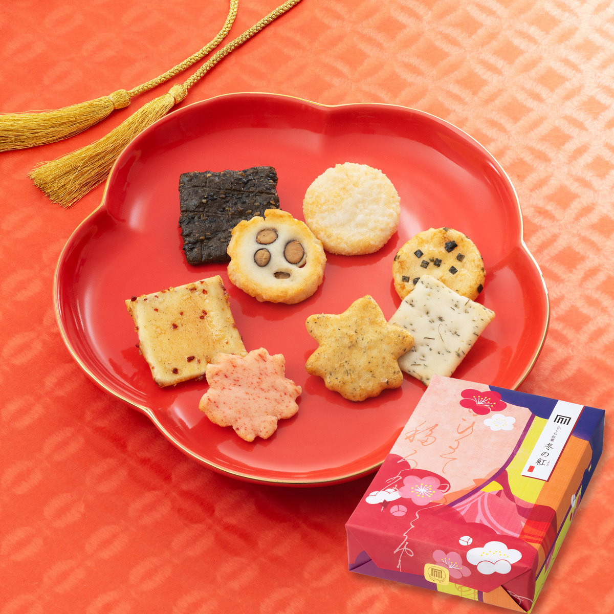 うるち米、植物油脂、もち米、砂糖、醤油、でん粉、ごま、水飴、落花生、発酵調味料、小麦粉、全卵、食塩、ぶどう糖、海苔、えび、寒梅粉、昆布エキス、寒梅粉ミックス(でん粉、もち米)、黒大豆、シラップ、紫芋ペースト、赤ワイン、黒ごま、紫芋粉、味噌、脱脂粉乳、あおさのり、昆布調味エキス、ごぼうシーズニング(砂糖、食塩、粉末醤油、でん粉分解物、乳糖、たんぱく加水分解物、ごま、マルトース)、麦芽エキスパウダー、蜂蜜、えび粉、酵母エキス、みりん、かつおぶしエキス、ゼラチン、果糖ぶどう糖液糖、醤油もろみ、梅肉、デキストリン、ごぼうミンス、醸造酢、桜葉粉、ひとえぐさ、椎茸エキスパウダー、香味ベース、昆布、でん粉分解物、かつおエキス、抹茶、寒天、香辛料、青のり、乾燥赤しそパウダー、ガーリックパウダー、白こしょうパウダー、調味塩、かつおぶし粉末、椎茸エキス、唐辛子、白こしょう、麦芽水飴/加工でん粉、調味料(アミノ酸等)、増粘剤(加工でん粉)、乳化剤、着色料(紅麹、カラメル、紅花黄、クチナシ、ラック、カロチノイド)、香料、膨張剤、酸味料、甘味料(ステビア、カンゾウ)、(一部に卵・乳成分・小麦・えび・かに・落花生・ごま・さば・大豆・豚肉・ゼラチンを含む)