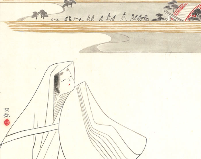二月、帝(みかど)は譲位して、朱雀院(すざくいん)と申しあげ、おんとし十一歳の冷泉帝(れいぜいてい)(実は源氏の子)が即位なさいます。御代(みよ)改まり、宮中に返り咲いた源氏の殿は内大臣(うちのおとど)へと昇進され、源氏一門はこのうえなく華やぎました。 三月には、明石の君に姫君がお生まれになります。このことを知った紫の上は、心おだやかではありません。源氏の殿は自分には三人の子が生まれ、それぞれが、帝、后、太政大臣(だじょうだいじん)になるという予言を思い出されます。その秋、お願果たし(お礼参り)に住吉詣でにお出かけになります。偶然、舟を仕立ててお参りに来ていた明石の君は、きらびやかな源氏一行を、遠くから眺めるばかりでした。「君はゆめにも知りたまわず・・」明石の君は、逢うことのかなわぬ身分の差を思い、そっと涙するのでした。
