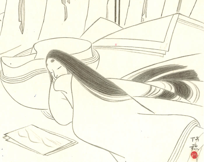 (末摘花は)古びた戸棚を開けて、唐守・藐姑射の刀自・かぐや姫の絵物語などを、その時々のおひまつぶしにしていらっしゃいます。