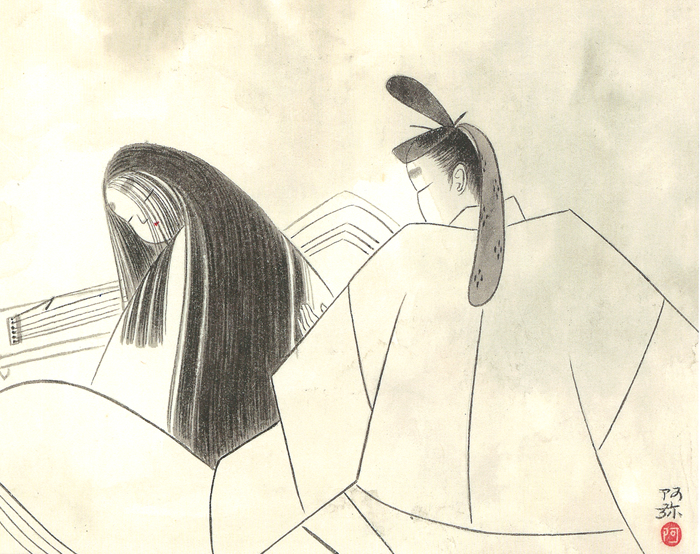 玉鬘は源氏の殿の庇護をありがたいものに思い、次第にお心をお許しになっていきました。 秋の夕まぐれ、琴を枕に、源氏の殿は玉鬘と添寝をなさいますが、それ以上のことはなさらず、ただ篝火の煙になぞらえて断ちがたい恋情を訴えるのでした。