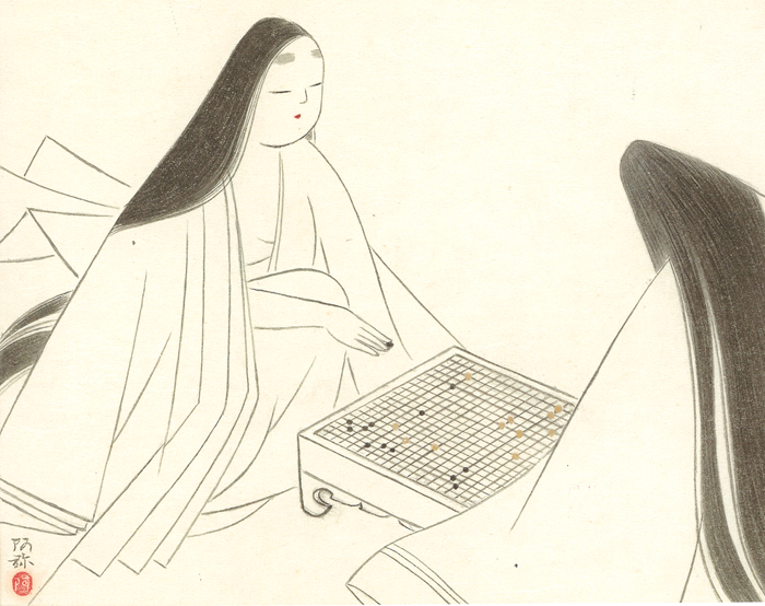 お昼から、西の御方さま(軒端荻)がお見えで、碁をお打ちになってらっしゃいます。 『碁を打つ軒端荻(左)と空蝉(右)』