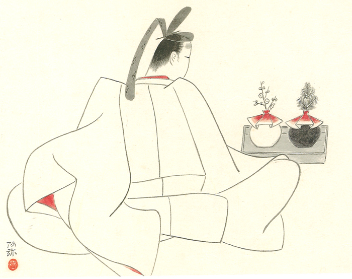 前斎院(さきのさいいん)・朝顔の君からも、紺瑠璃(こんるり)・白瑠璃(しろるり)の香壺(こうご)に入れた 薫物(たきもの)が贈られ、螢宮(ほたるのみや)を判者にお迎えして、薫物合が行われました。 夜には宴になり、翌る日の裳着の式は、この上もなく時めいて華やかなものになりました。 しかしご嫡男の夕霧さまは、雲居雁の姫君が忘れられず、今もおひとりのままです。