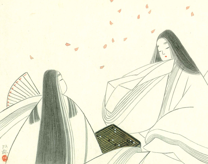 と、お美しい姉妹は努めて明るくふるまい、桜を賭けて、碁の遊びにお興じになります。 さて、一の姫君にはたくさんの求婚者がおいででしたが、 玉鬘さまは若い頃の償いもこめて、冷泉院さまのお側に差し上げます。 しかし先にお妃になっていた弘徽殿女御(こきでんのにょうご)のご嫉妬は激しく、いたたまれず、お里に帰ってしまいます。娘のその気苦労の多い宮仕えを思うにつけ、玉鬘さまは嘆きになったということです。